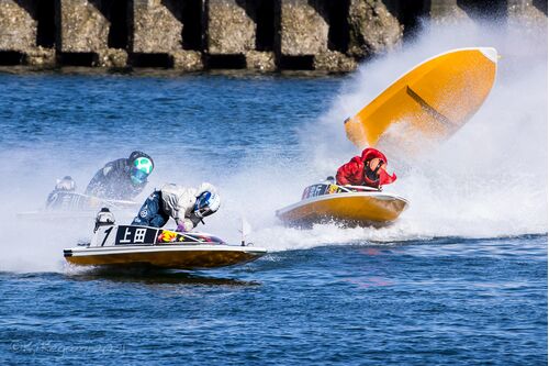 最強の布陣 11R①上田龍星(大阪)07②吉川貴仁(三重)06③宗行治哉(広島)07④片岡大地(東京)06⑤井上忠政(大阪)12⑥鈴谷一平(兵庫)08 1周2マークで井上がバランスを逸して転覆したため、残念ながら正味1周だけのバトルになってしまった。勝ったのは…
