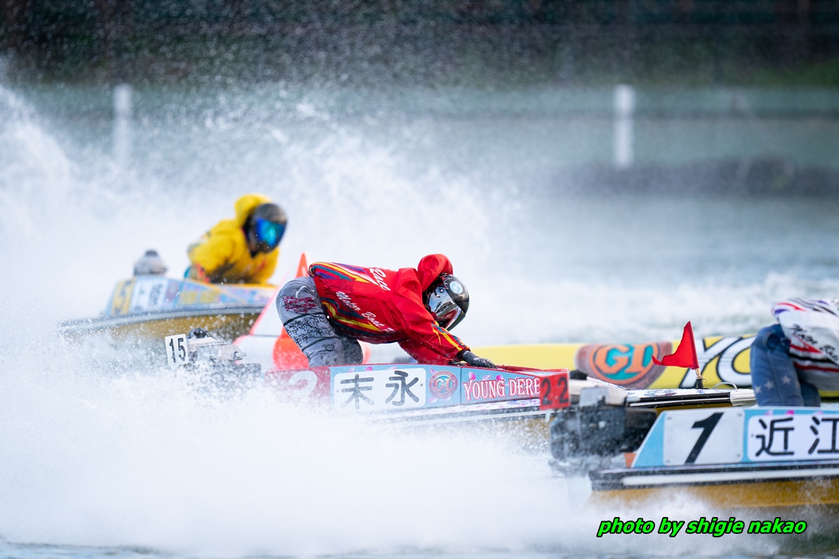 3周1マークでは、ほんの一瞬だが末永の舳先が突き刺さったように見えた。なんちゅうターンスピード!! 節イチ級の出足も後押しして、サイドの掛かりもエグすぎる。私も含めてスタンドに陣取った観衆は、「えっ!?」とか「おっ!?」とか疑問符の叫びを挙げつつ、あとは固唾を呑んで見守っている。