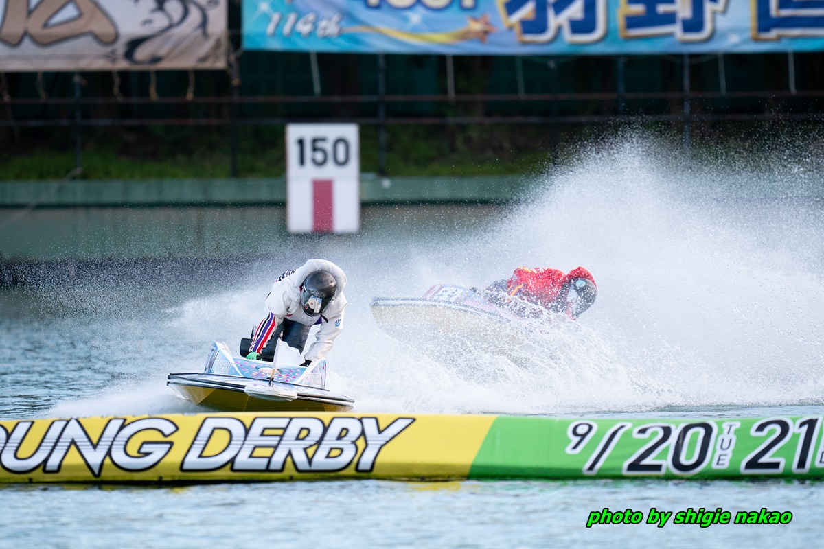 ヤングの祭典とはいえ、ふたりのデビューは8年半も違う。12年前にデビューして今回がラストチャンスの107期が必死に逃げる。デビューして3年ちょいの若武者が容赦なく追い上げる。3周バックの差は2艇身ほどだが、私の目には佐賀の若き鬼武者が獲物を捕えきったように映った。